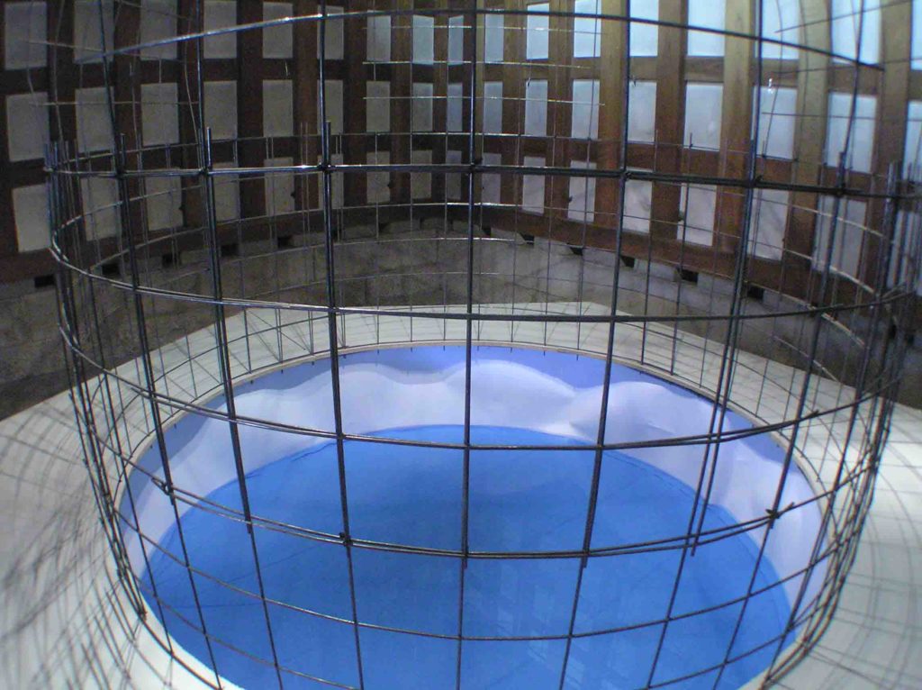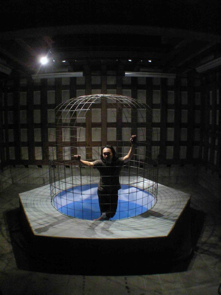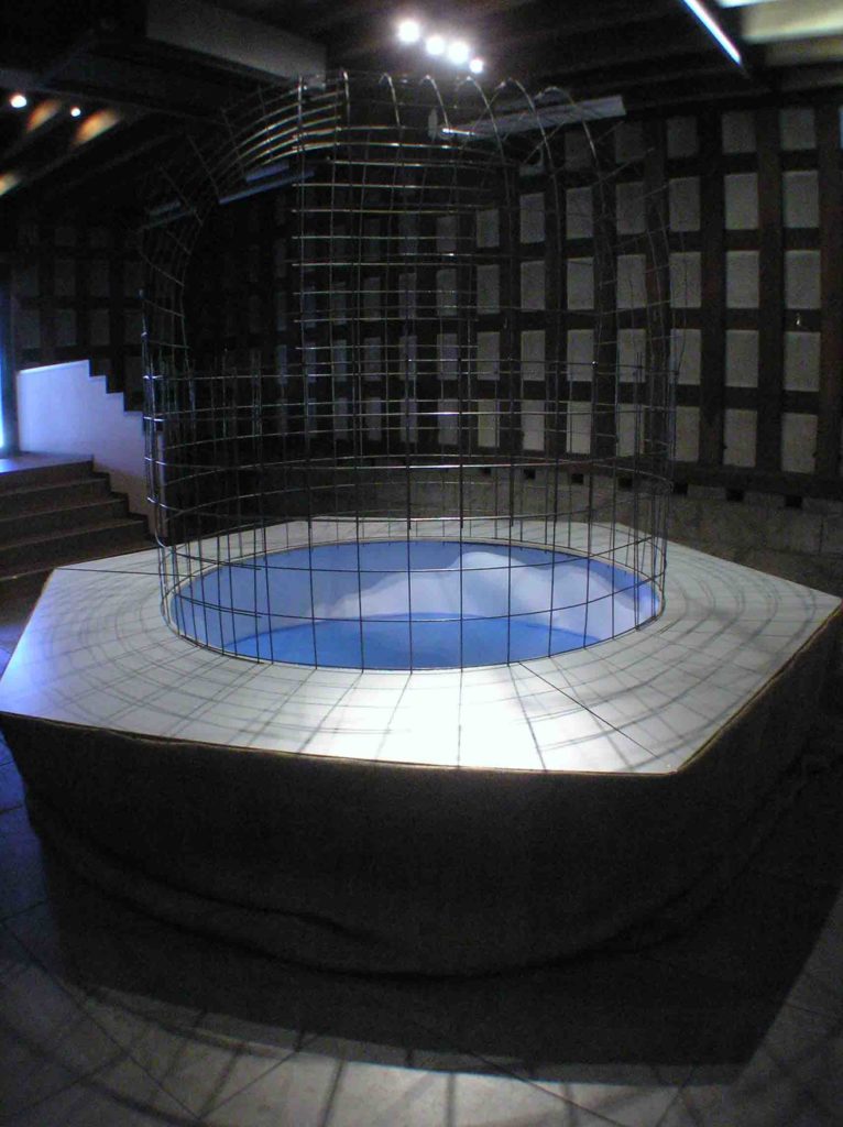 8月15日の終戦に合わせて開催した個展で制作したインスタレーション、会場のギャラリー沙蔵が長岡空襲に耐えた蔵の中で建物の骨組みを意識した構造の真ん中に水を溜め光を上からあてた。